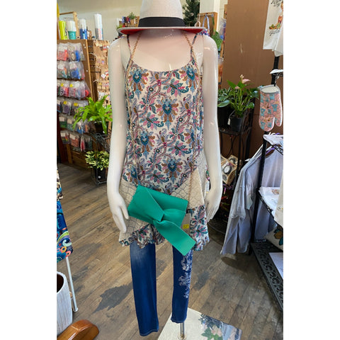 A vibrant floral paisley top paired with blue patterned leggings. Finished with a green clutch and white fedora for a true boho-chic vibe!